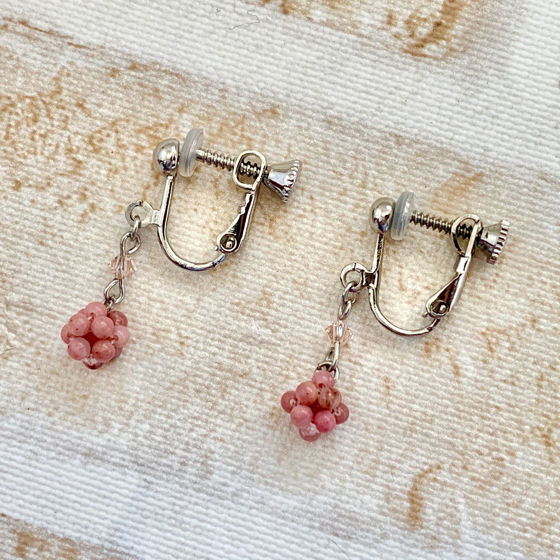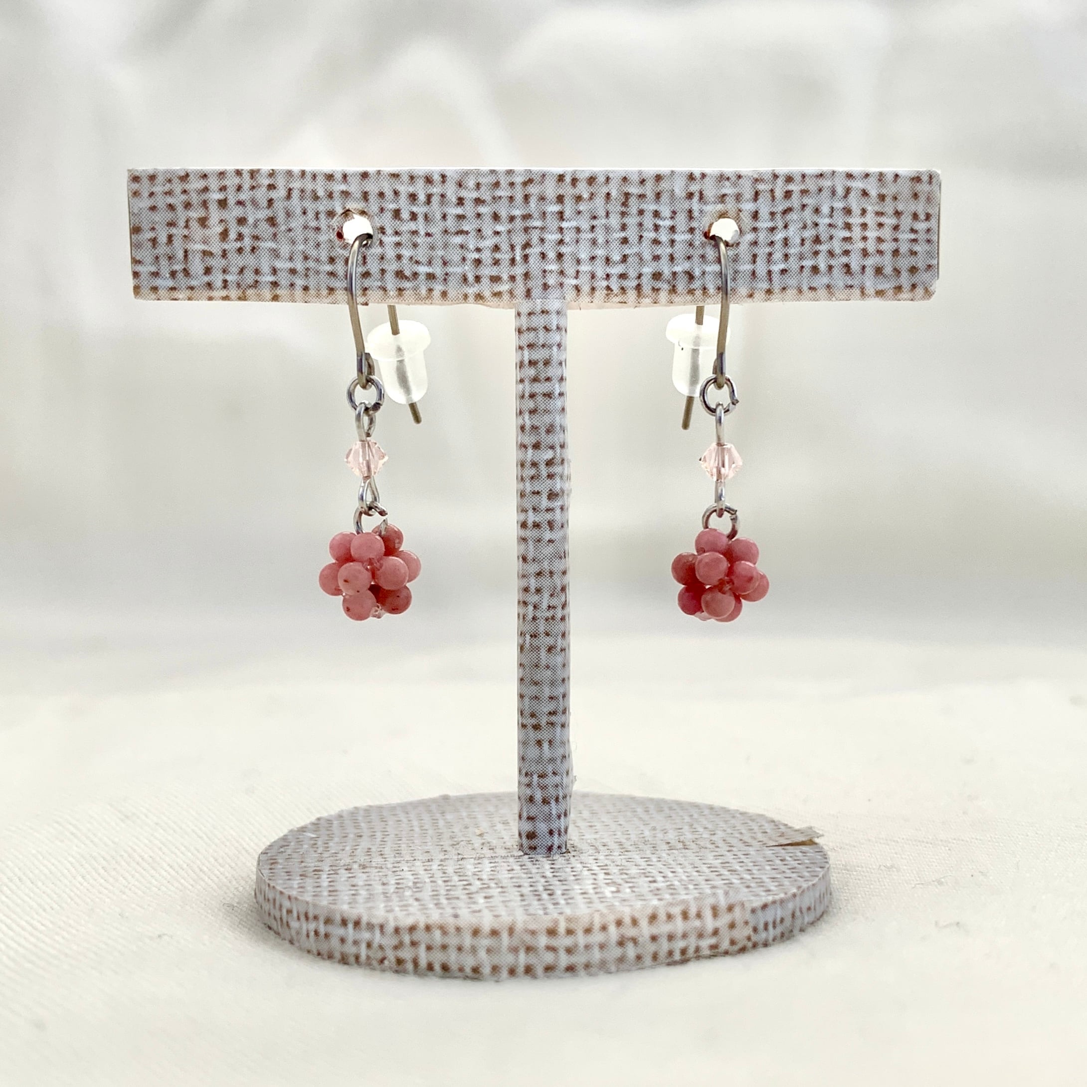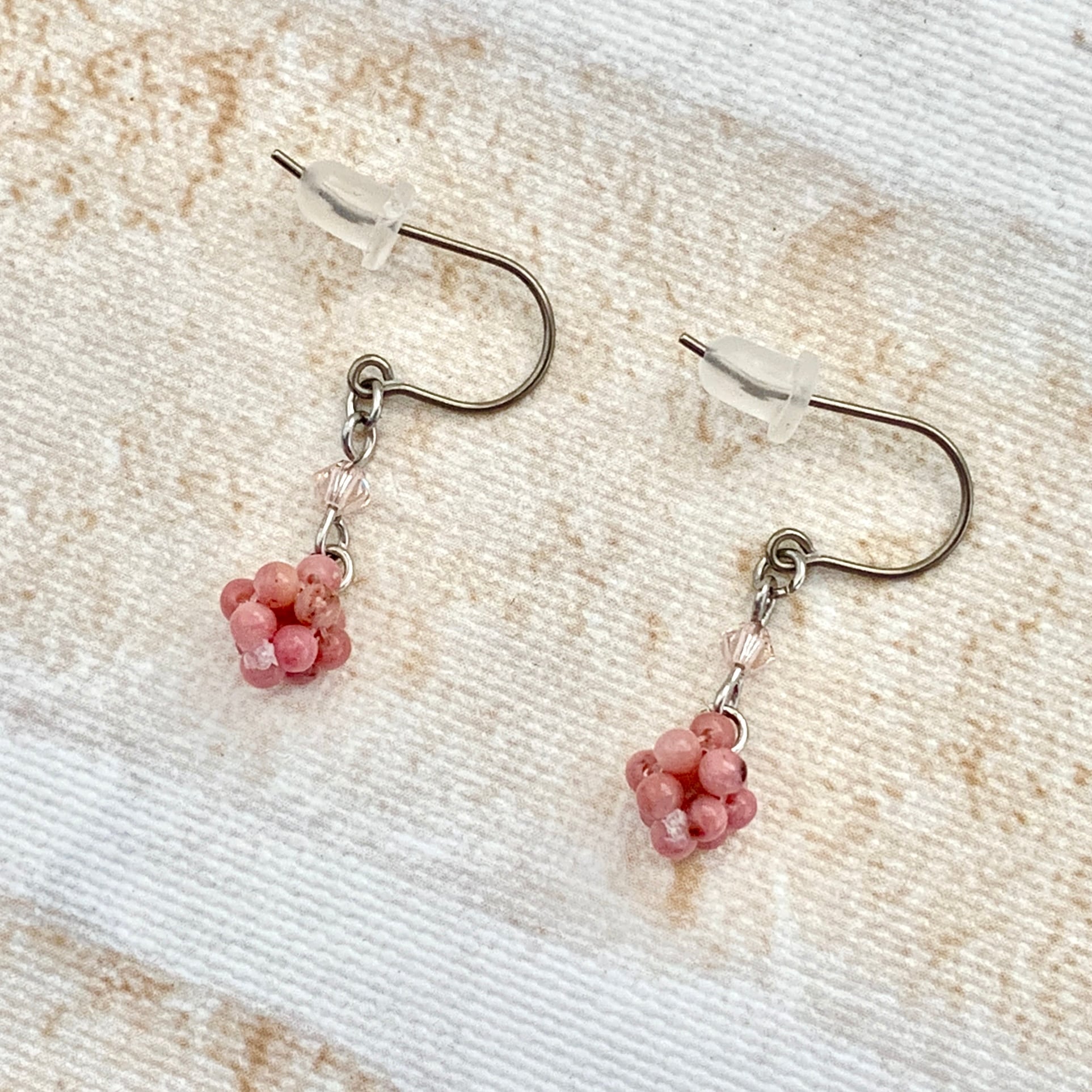 2㎜サイズの小さな粒をテグスでボール状に編んでいるピアスorイヤリングです。