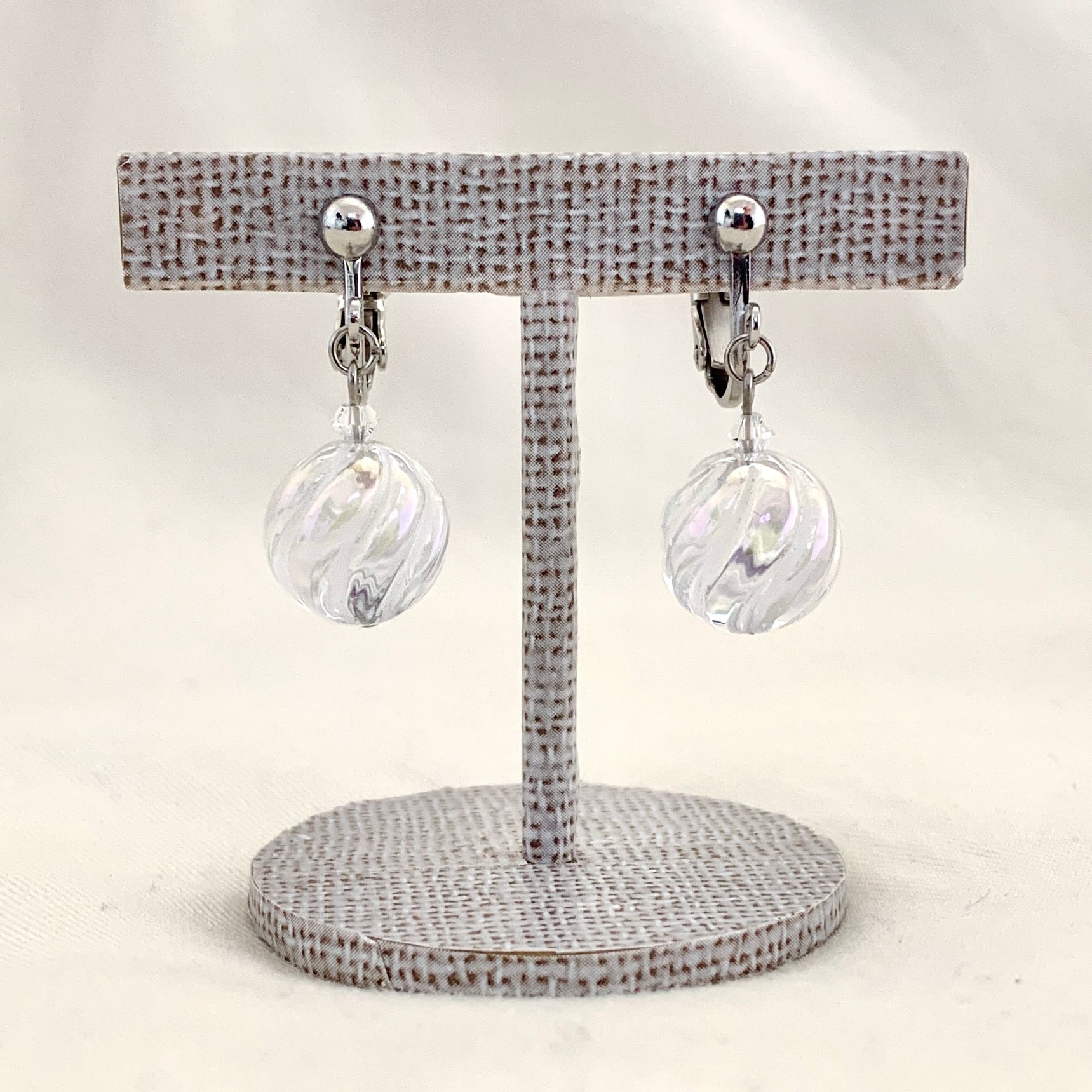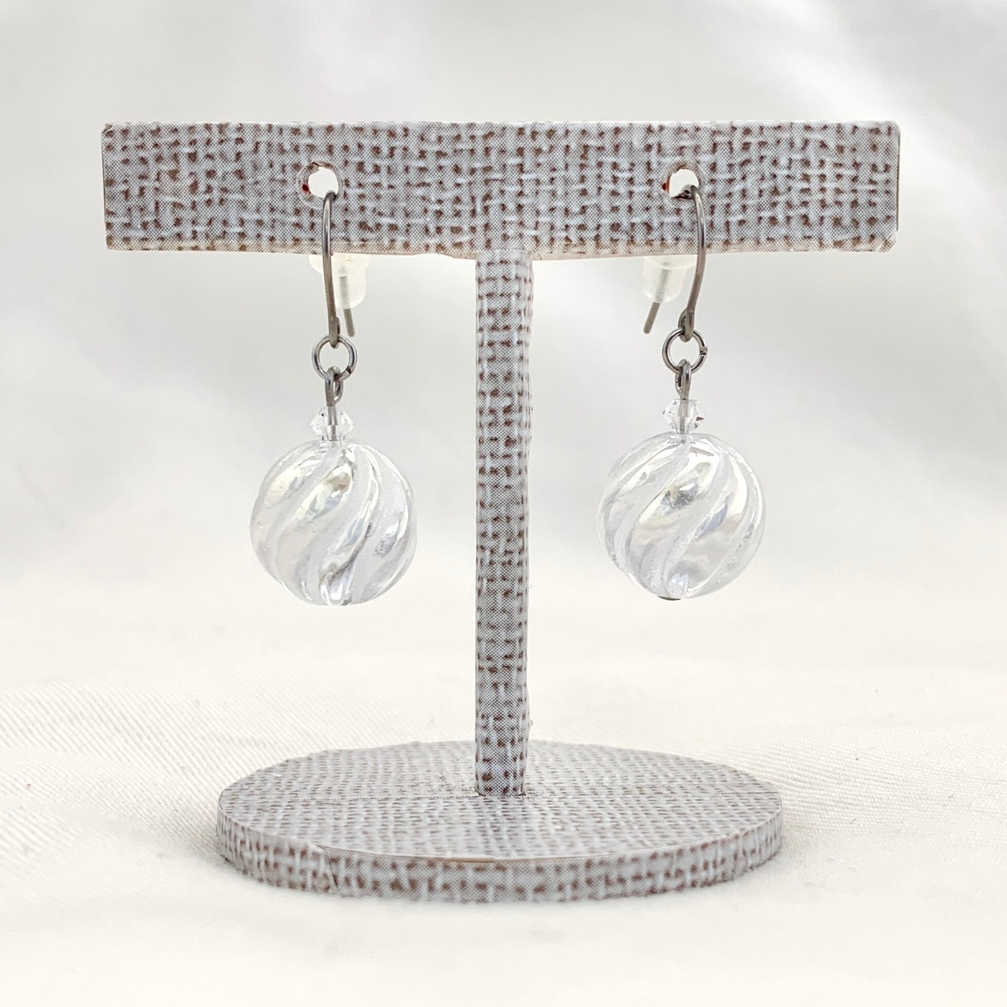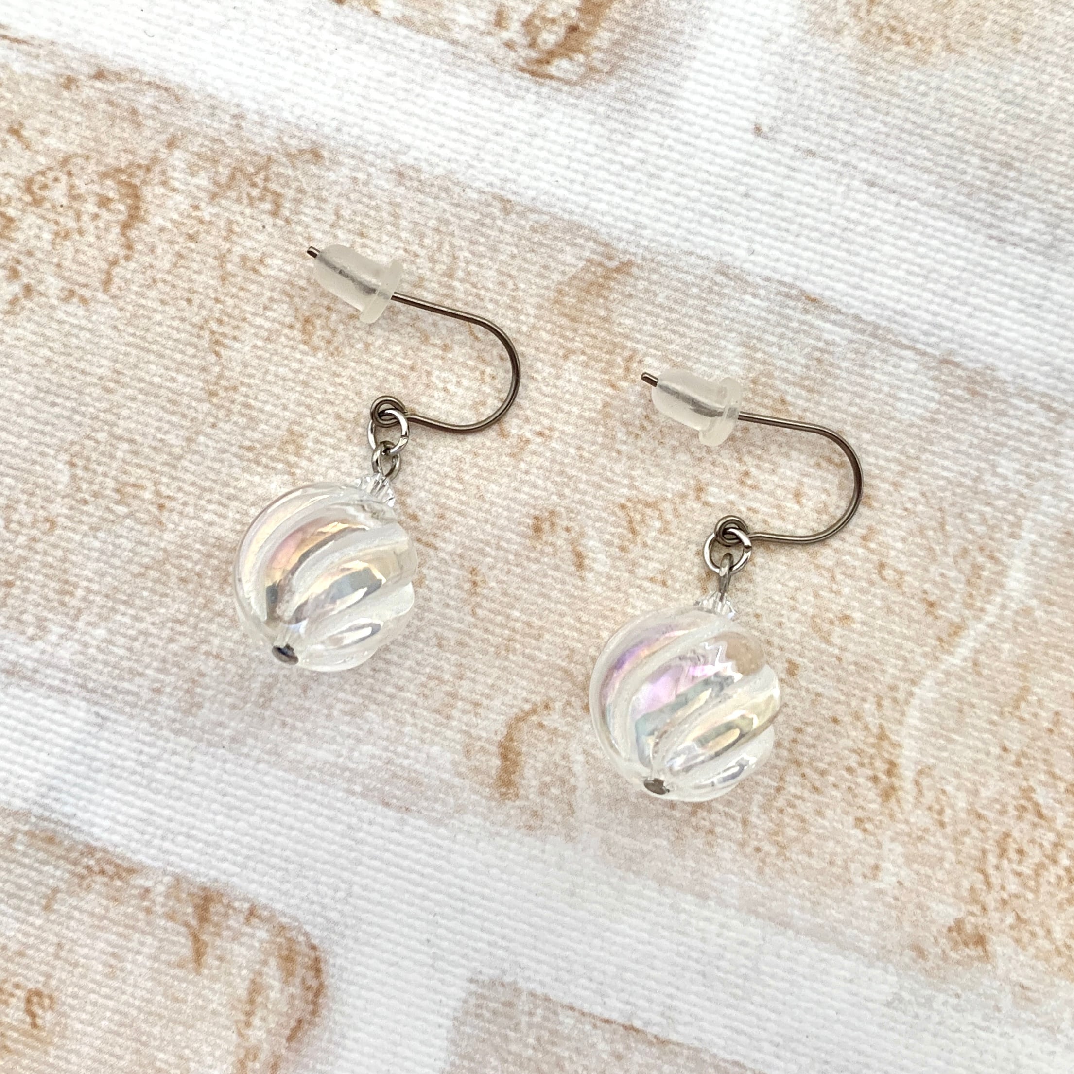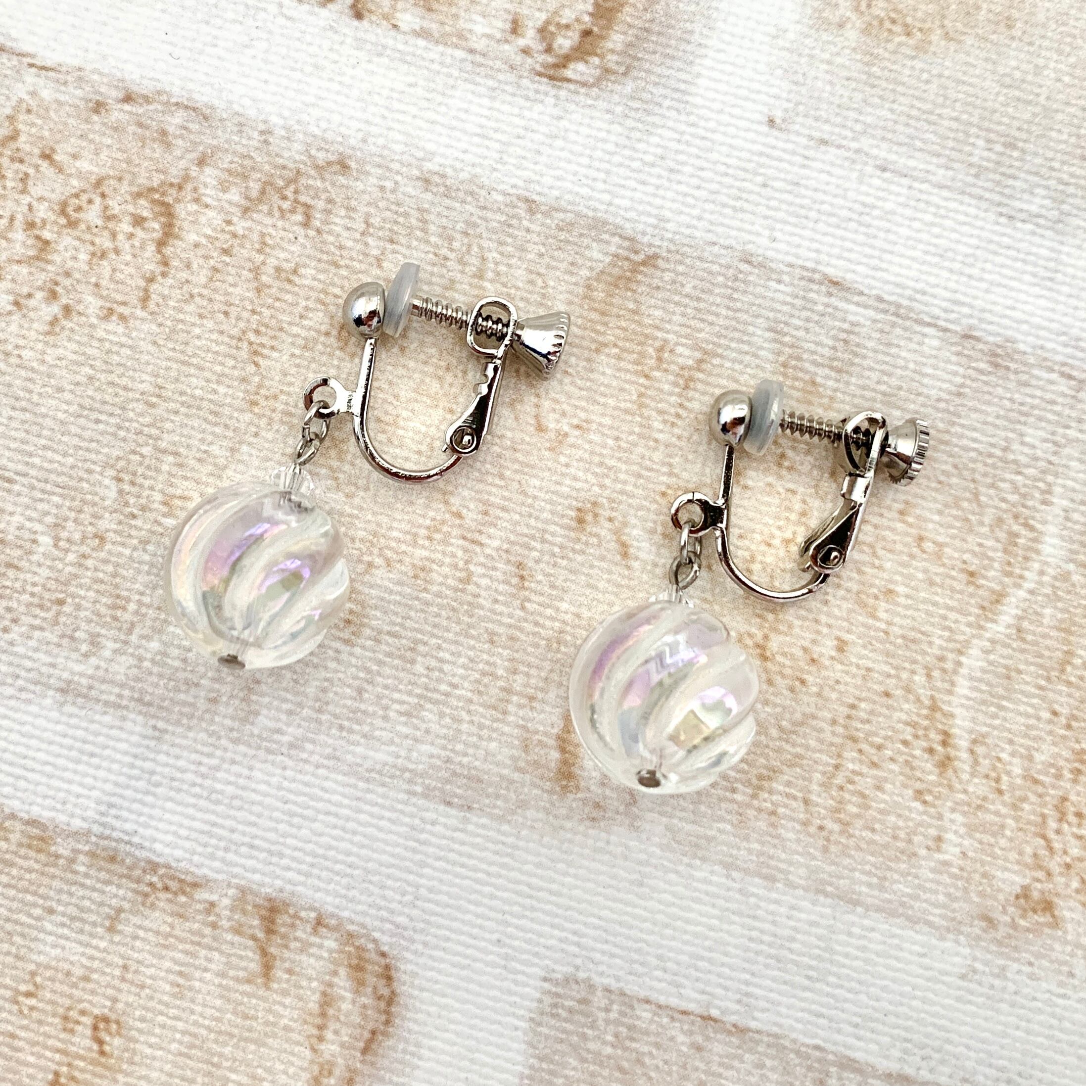こちらのピアスorイヤリングはシャボン玉のような美しい輝きを放つアクアクリスタルにSラインの彫刻が施されており通常のラウンドカットとはひと味違った趣があるデザインとなっております。