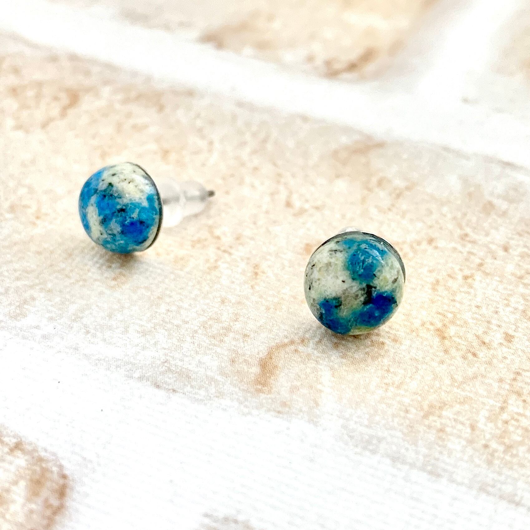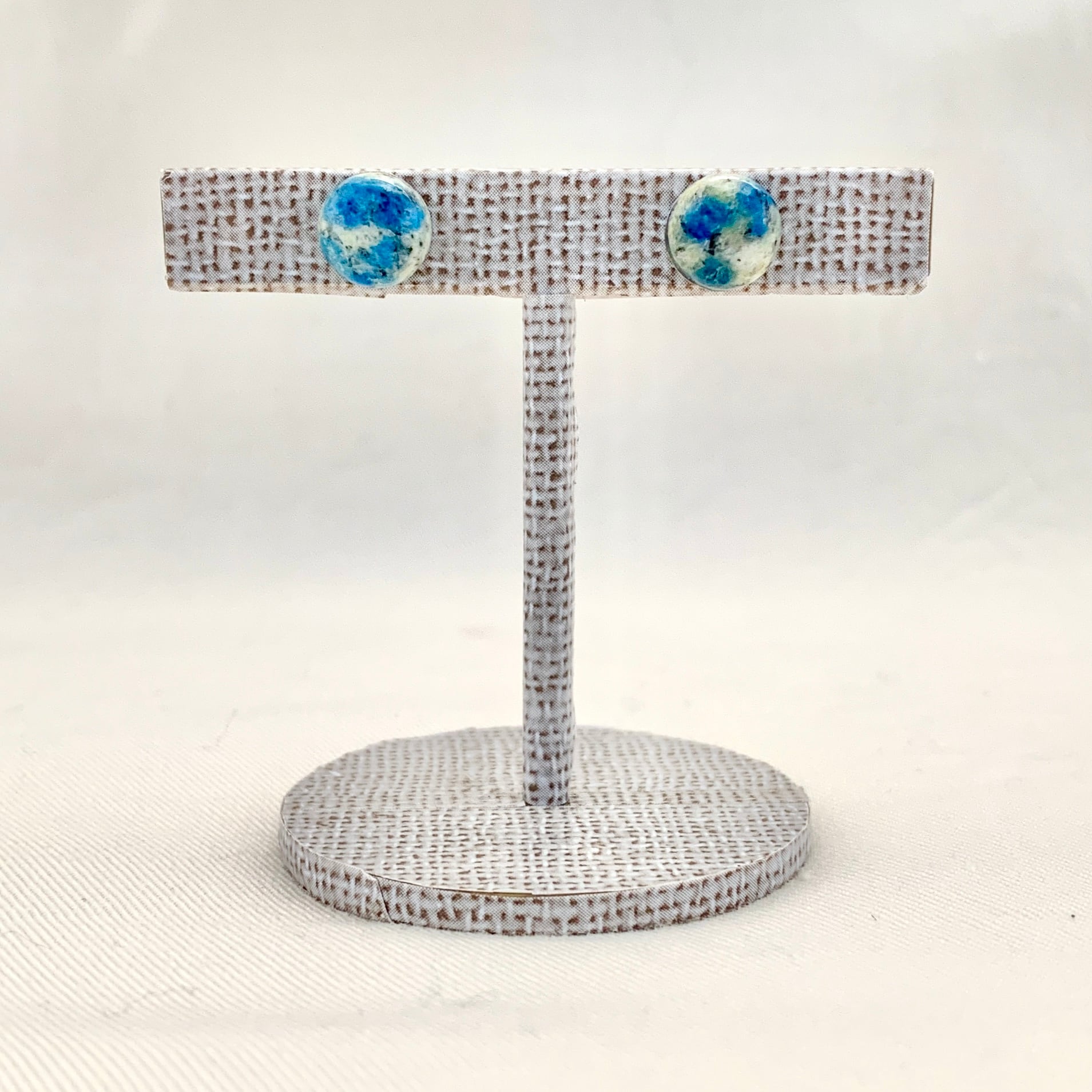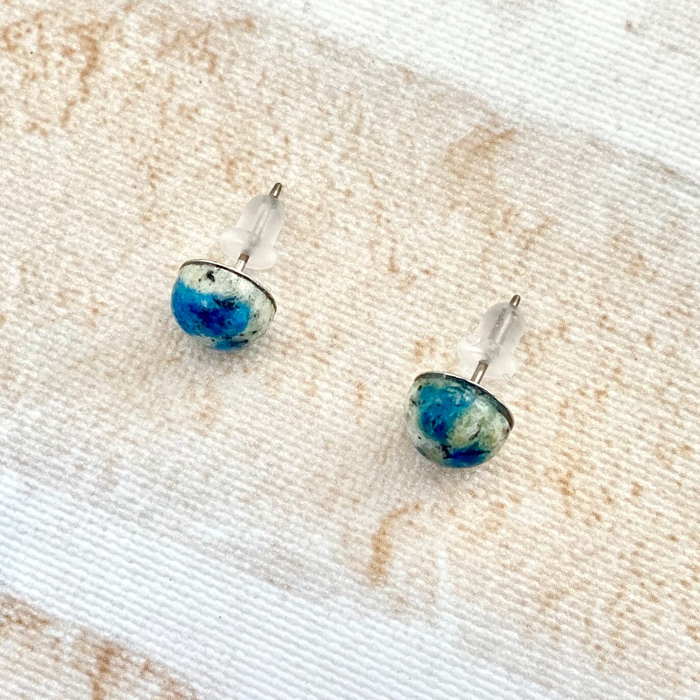 ベースの白っぽい部分はグラナイト、ブルーの部分がアズライトで独特の模様が個々に違い、それぞれ雰囲気のある模様が楽しめるピアスです。