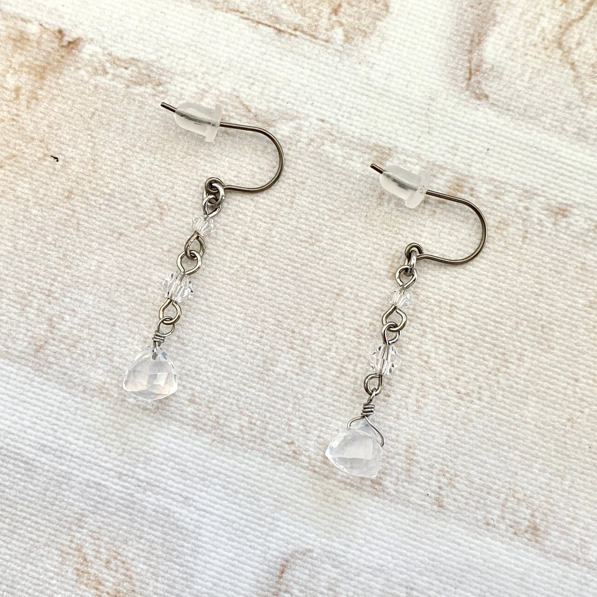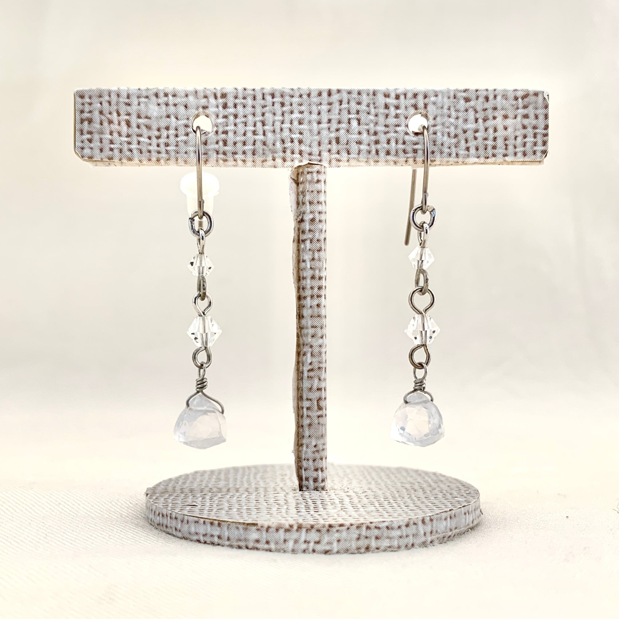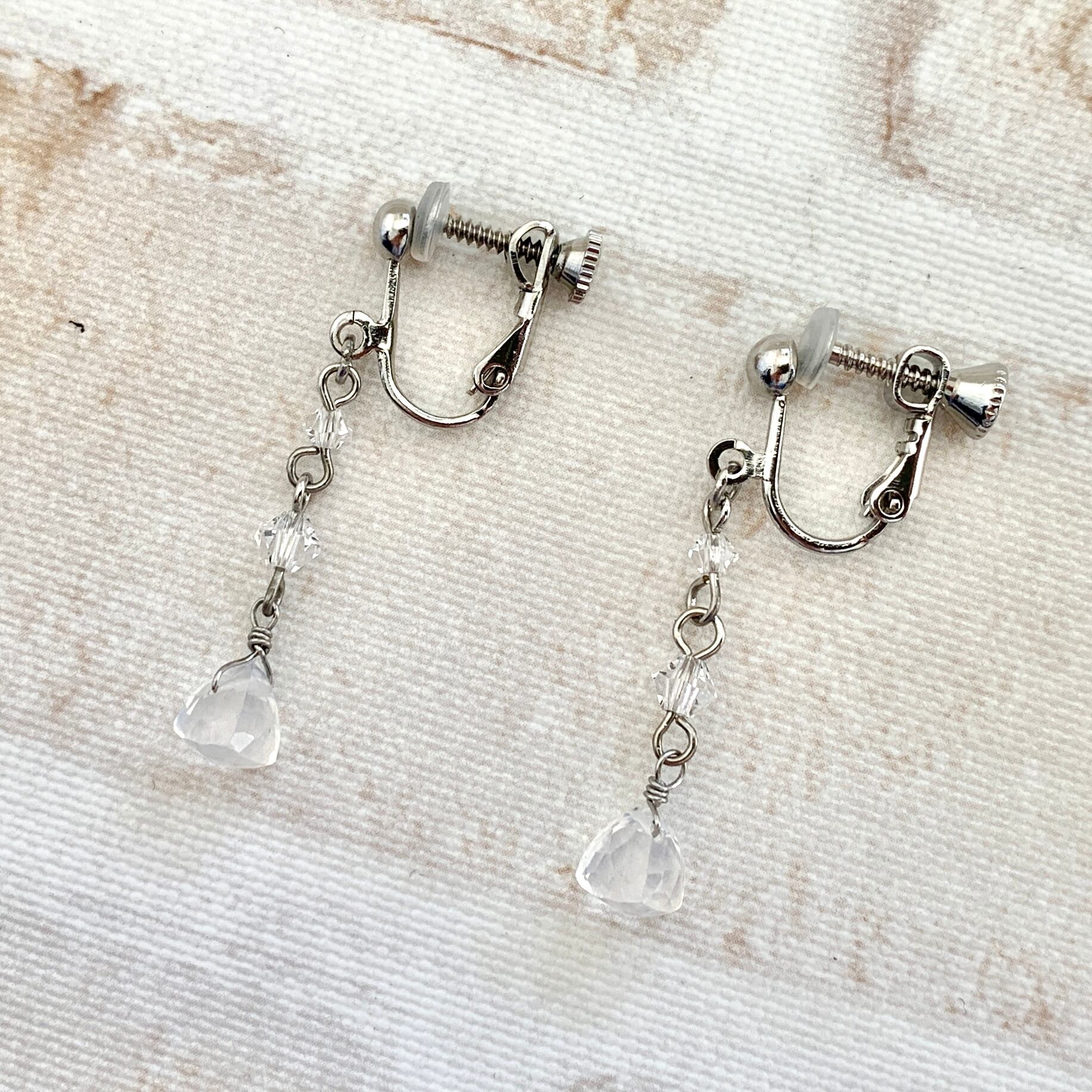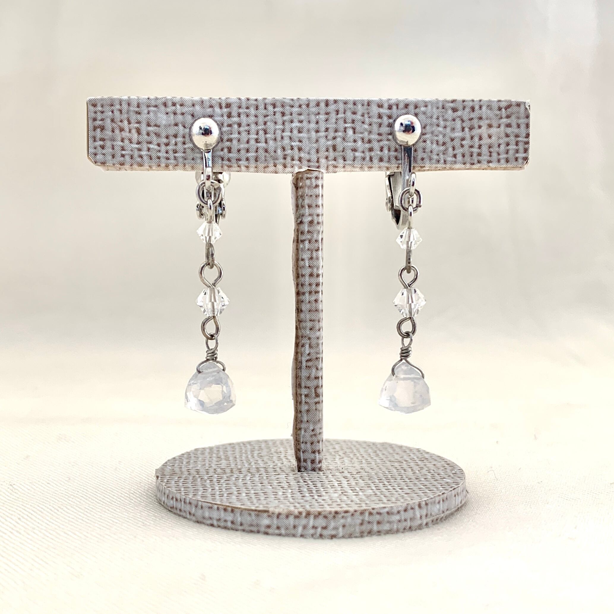 トライアングルカットのミルキークォーツとクリスタルガラスを用いたロングデザインピアスのご紹介です。