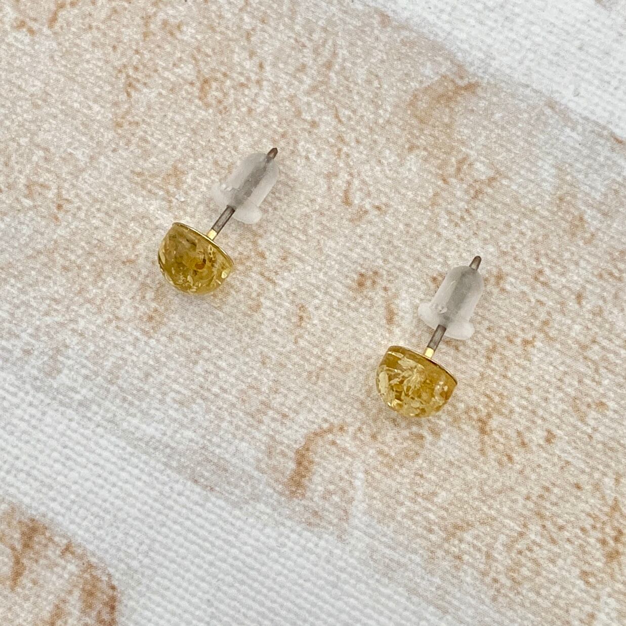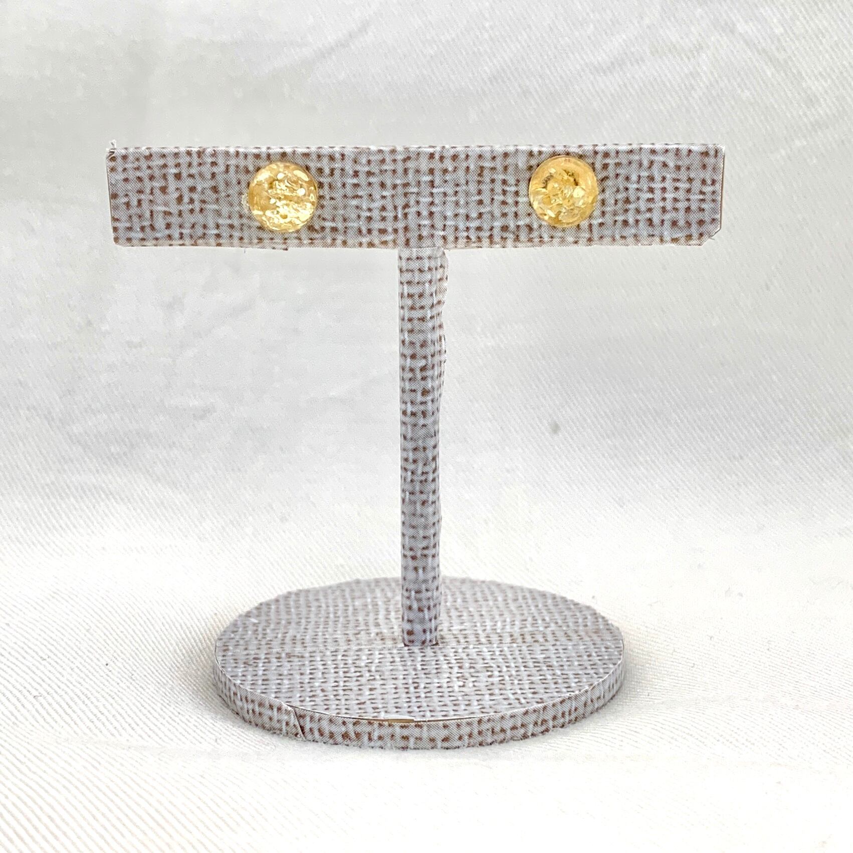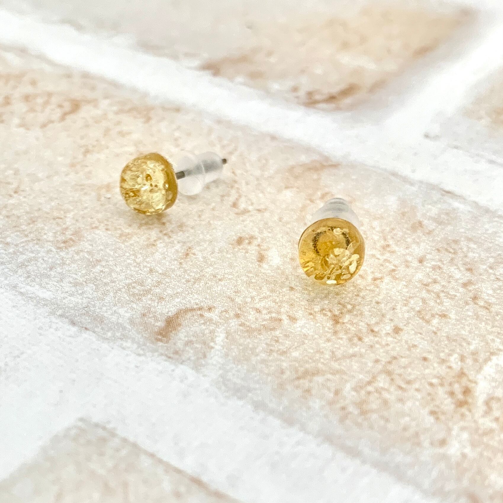 こちらはクラックが入った琥珀が光を反射してラメのようにキラキラと輝くとても綺麗なピアスです。