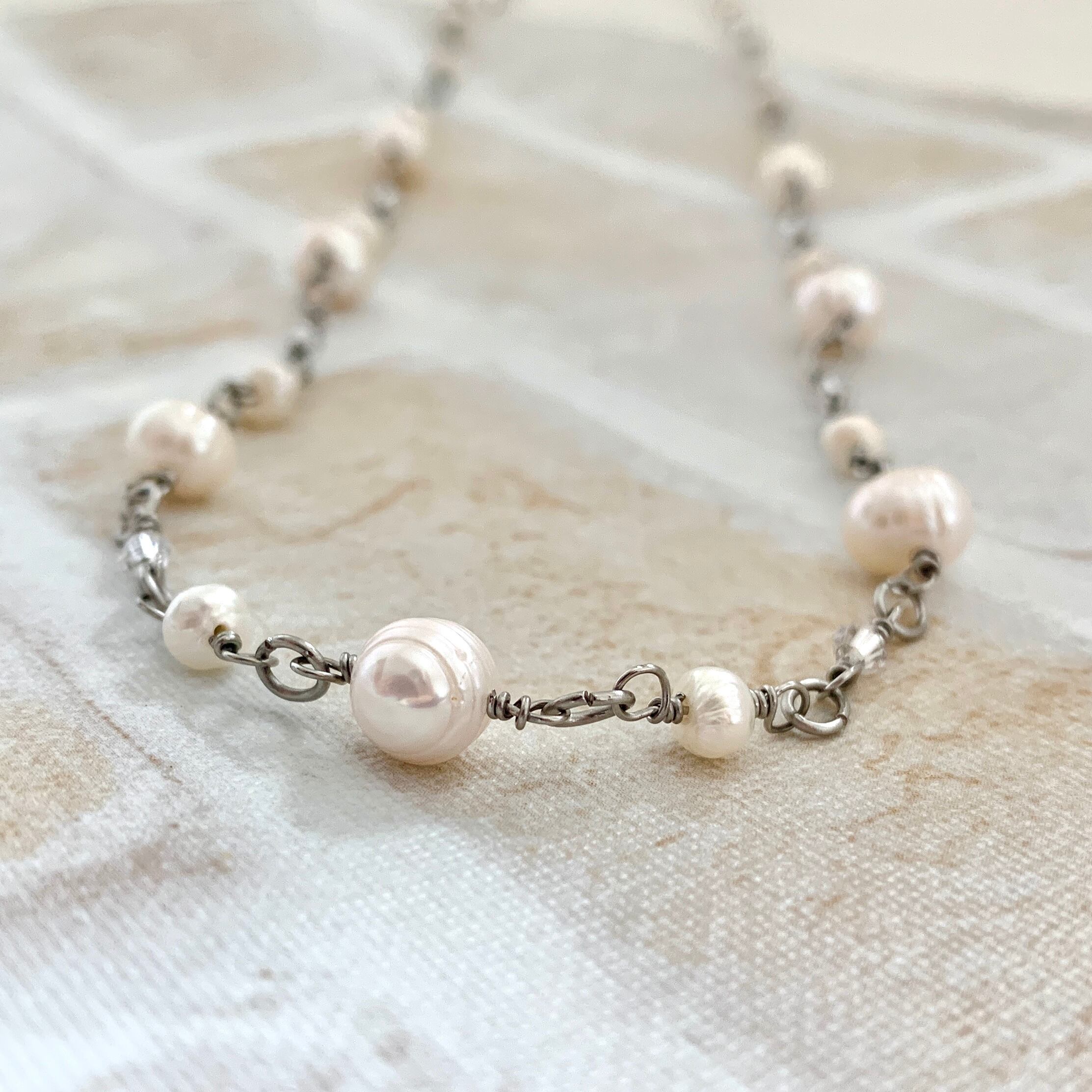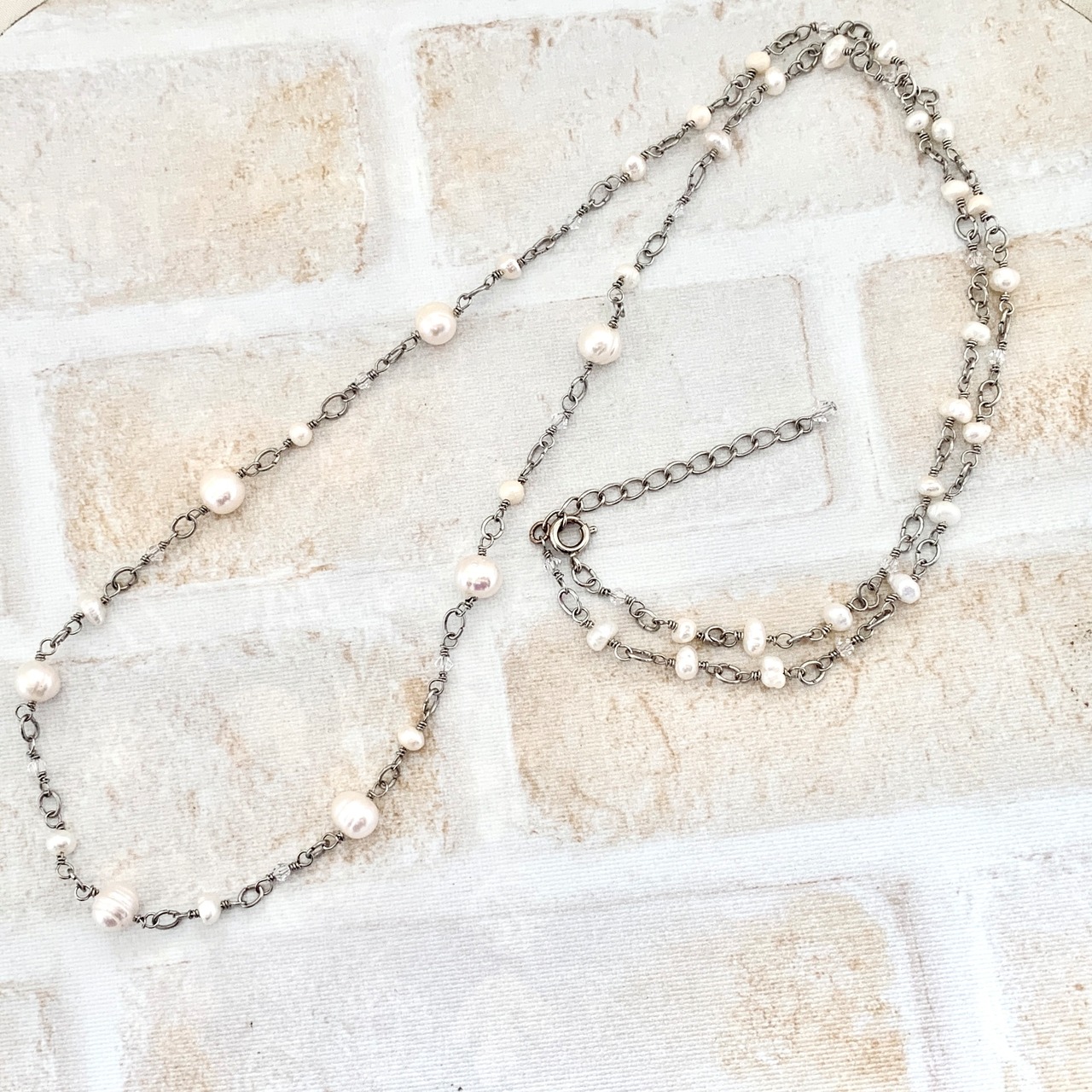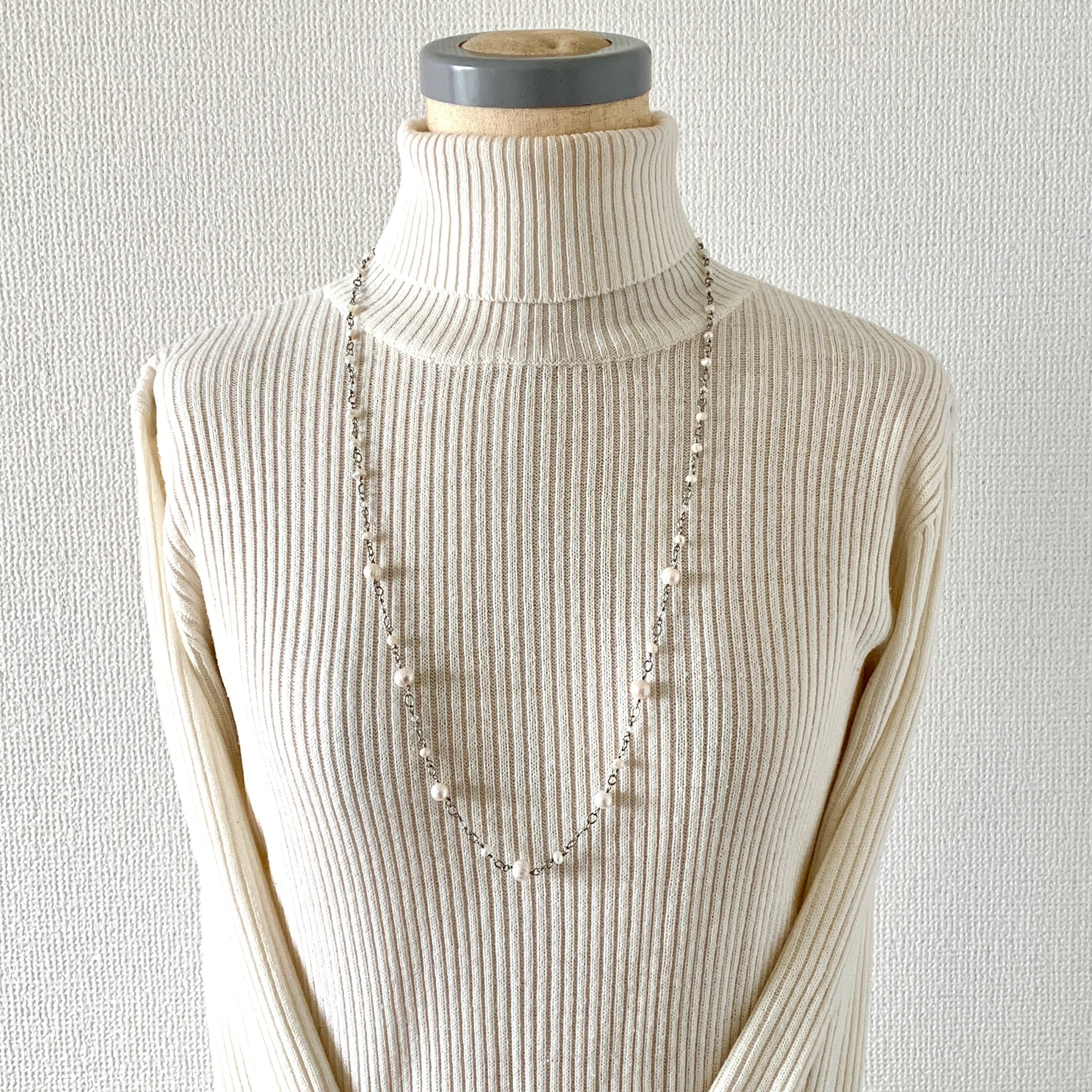こちらのネックレスは丸に近いポテト型約4㎜玉と約7㎜玉の淡水パールと小さなクリスタルガラスを用いて、ヒキワを外さずにすっぽりと被って頂ける着脱簡単なロングサイズでお作りしております。