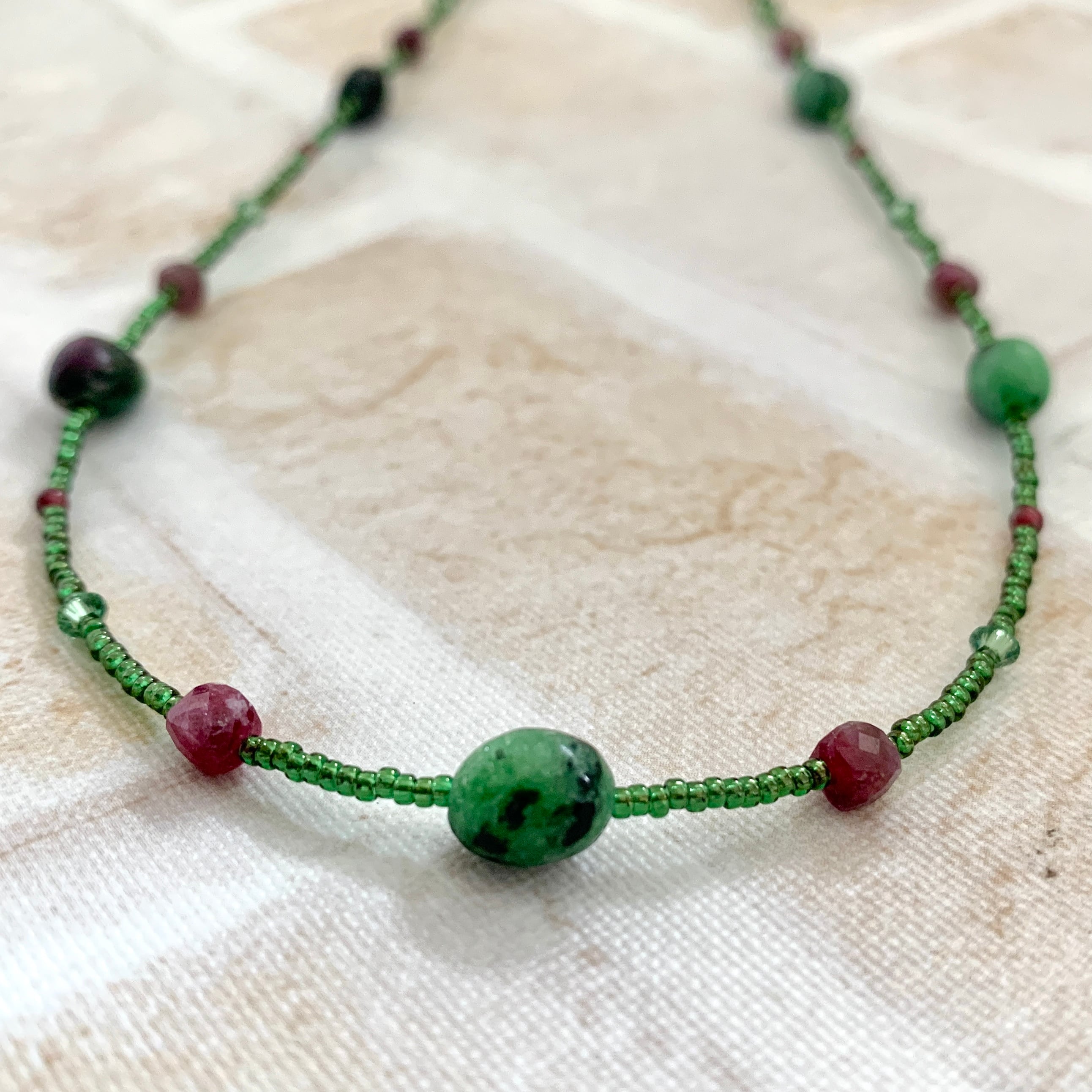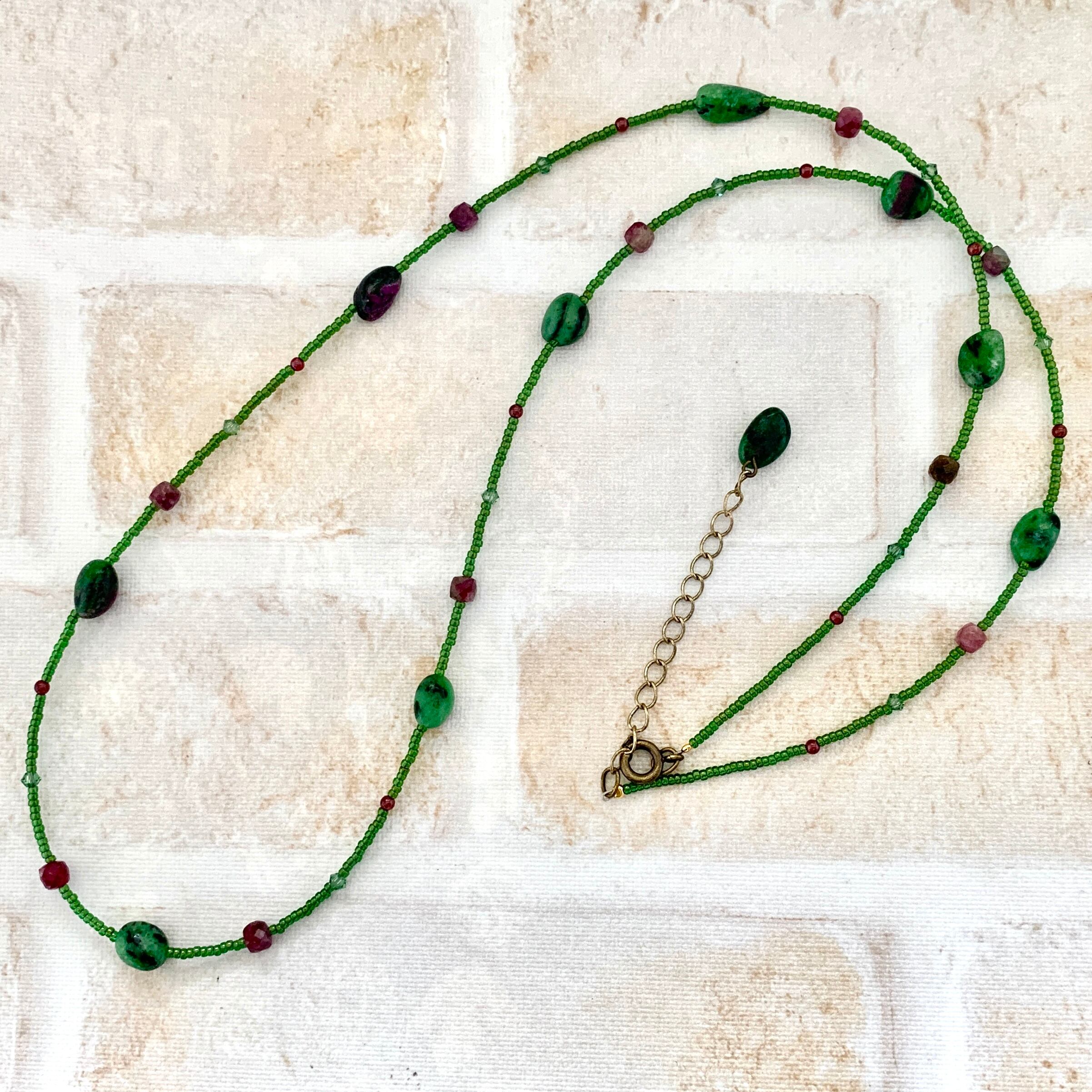 ゾイサイトの部分はグリーンにブラックが混ざってクールな色合いで、そこにルビーの深い赤が差し色のように入っています。