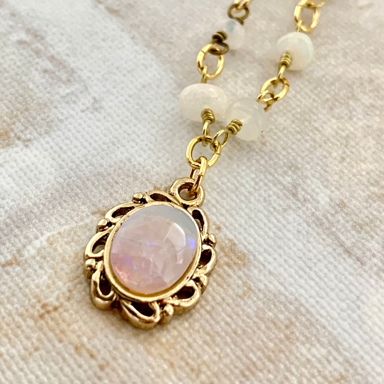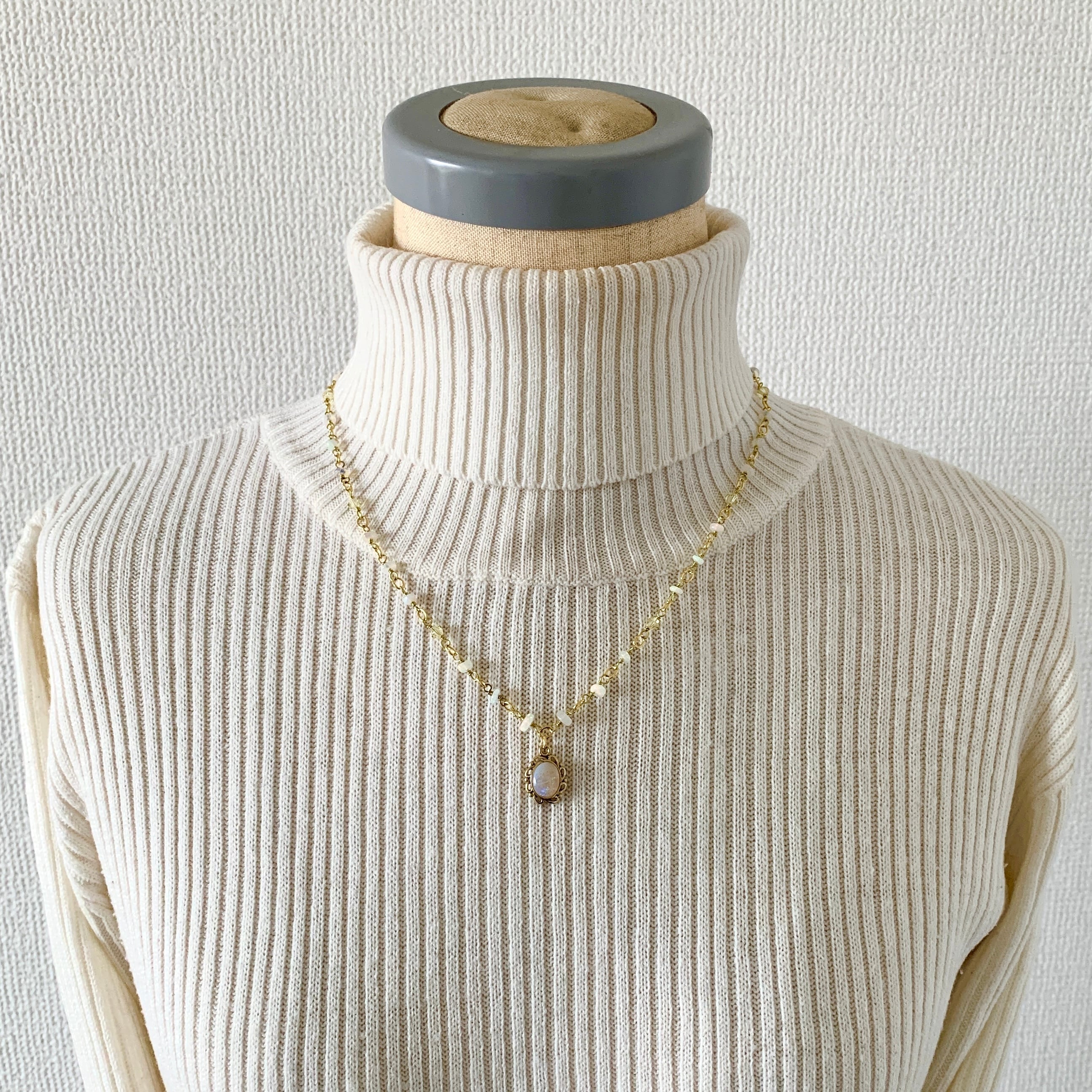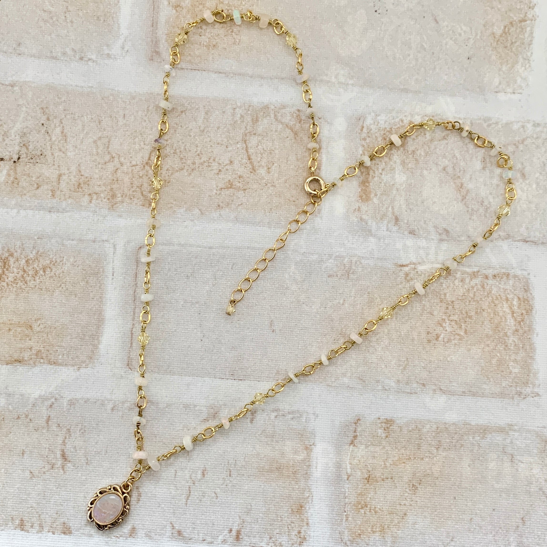 ロンデル型のオパールをクリスタルガラスと合わせチェーンのように繋ぎ、ペンダントトップはアンティーク風な枠にお入れしました。