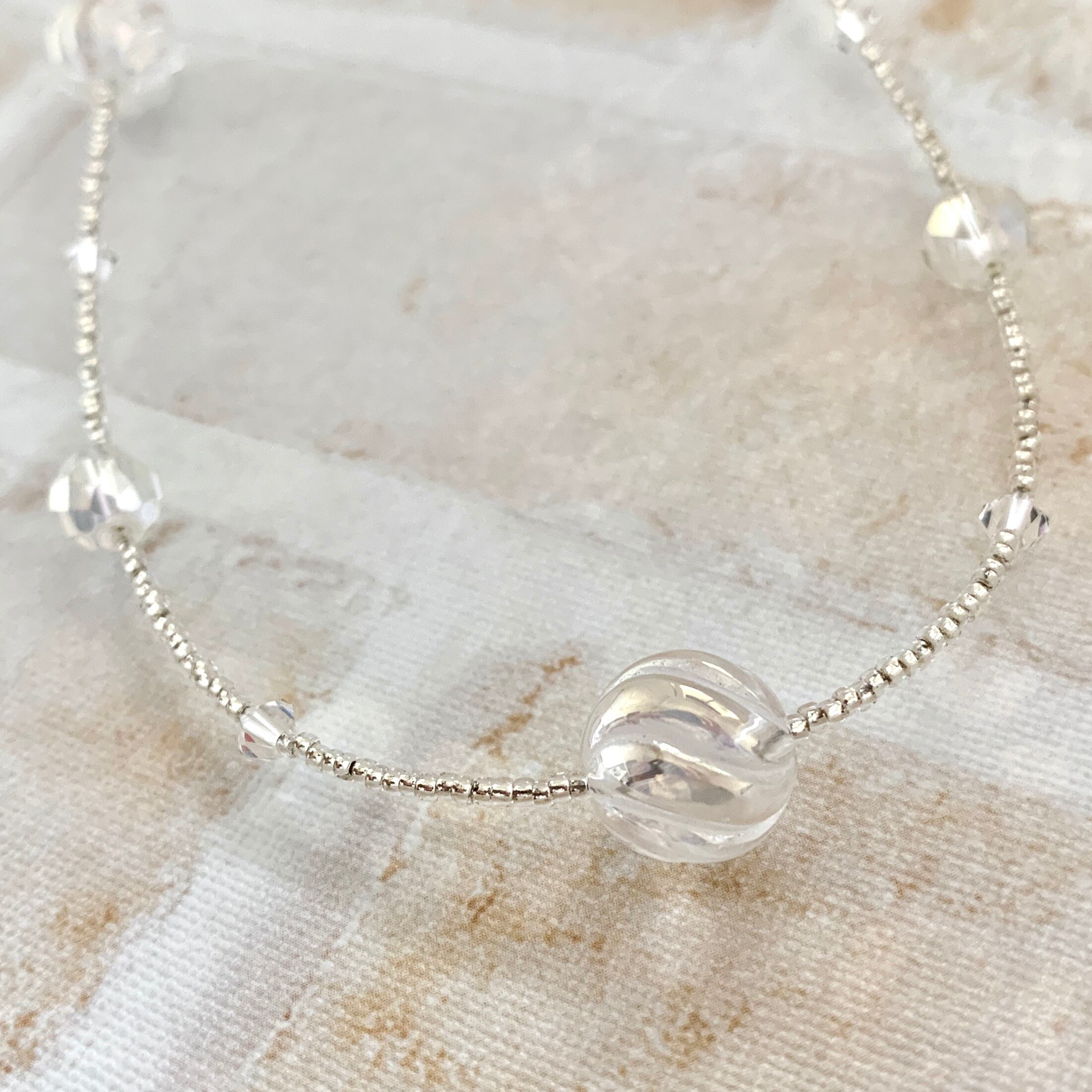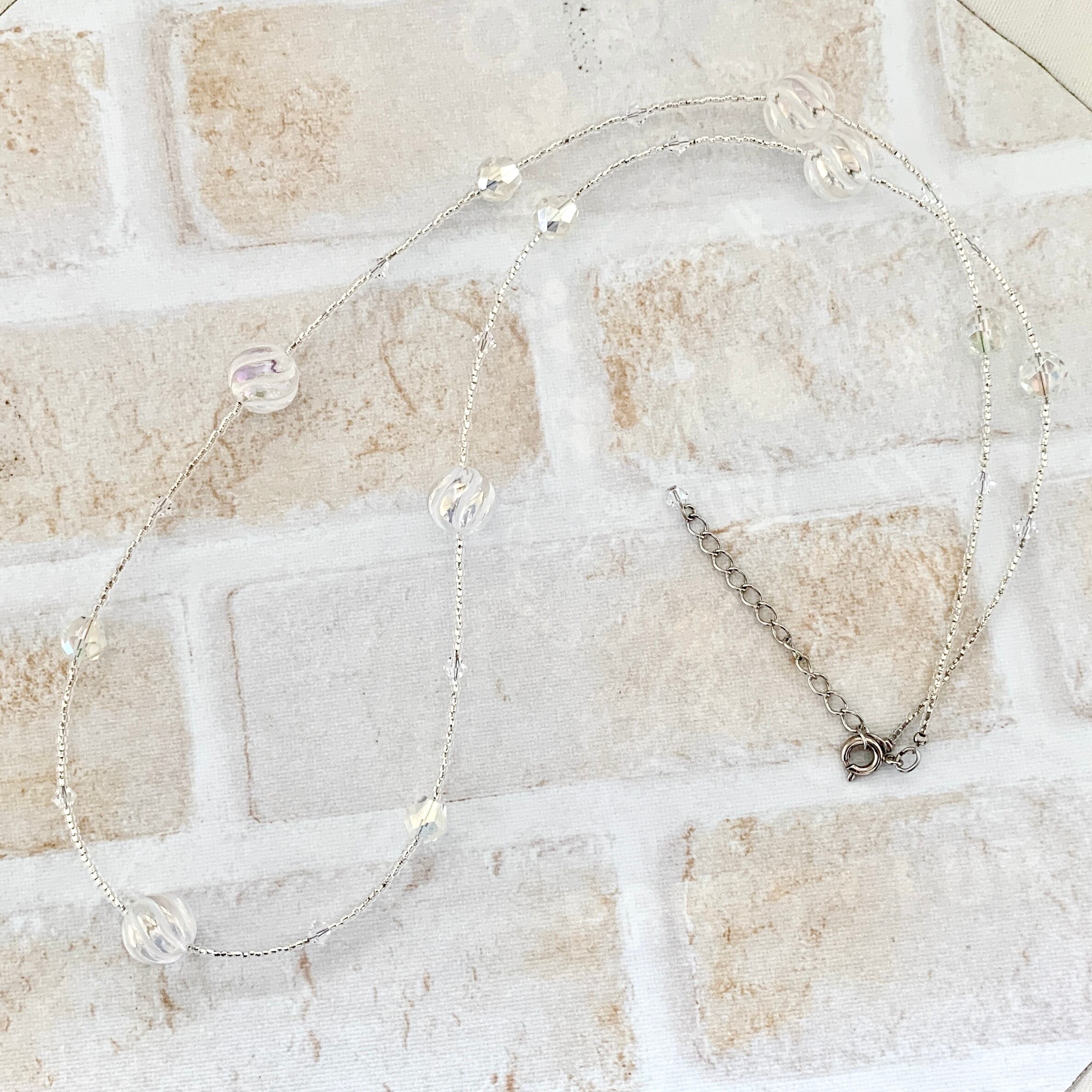 Sラインツイストラウンドカットとドロップカットのアクアクリスタルと小粒サイズのクリスタルガラスと特小サイズのガラスビーズを用いたロングデザインのネックレスのご紹介です。