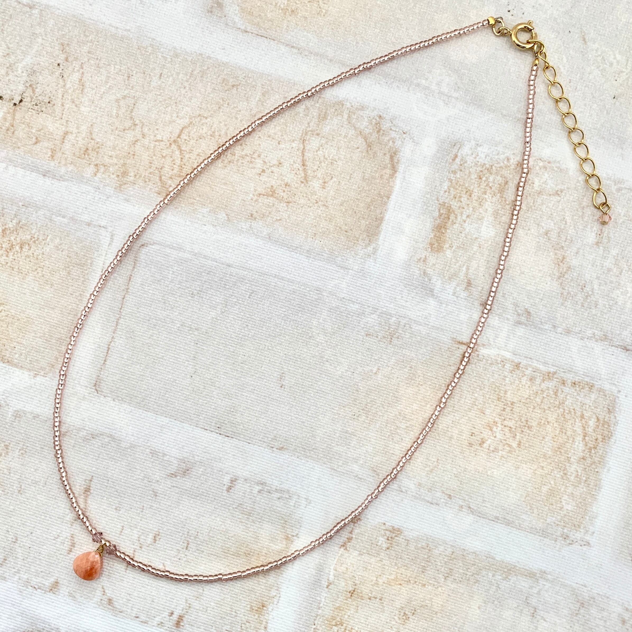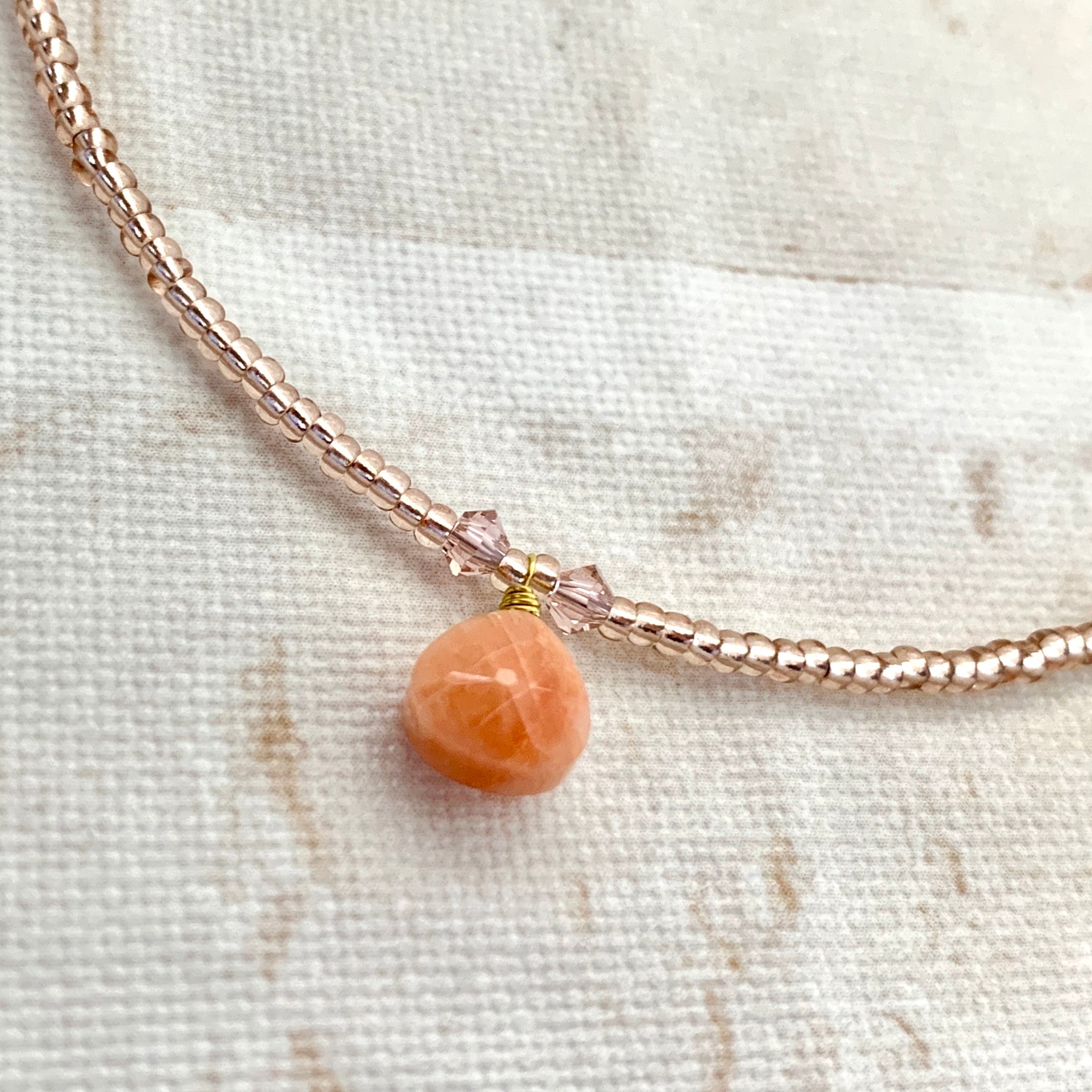 長石類の一種でミルキーなオレンジ色に原石由来の模様が見られる可愛らしいお色の天然石。