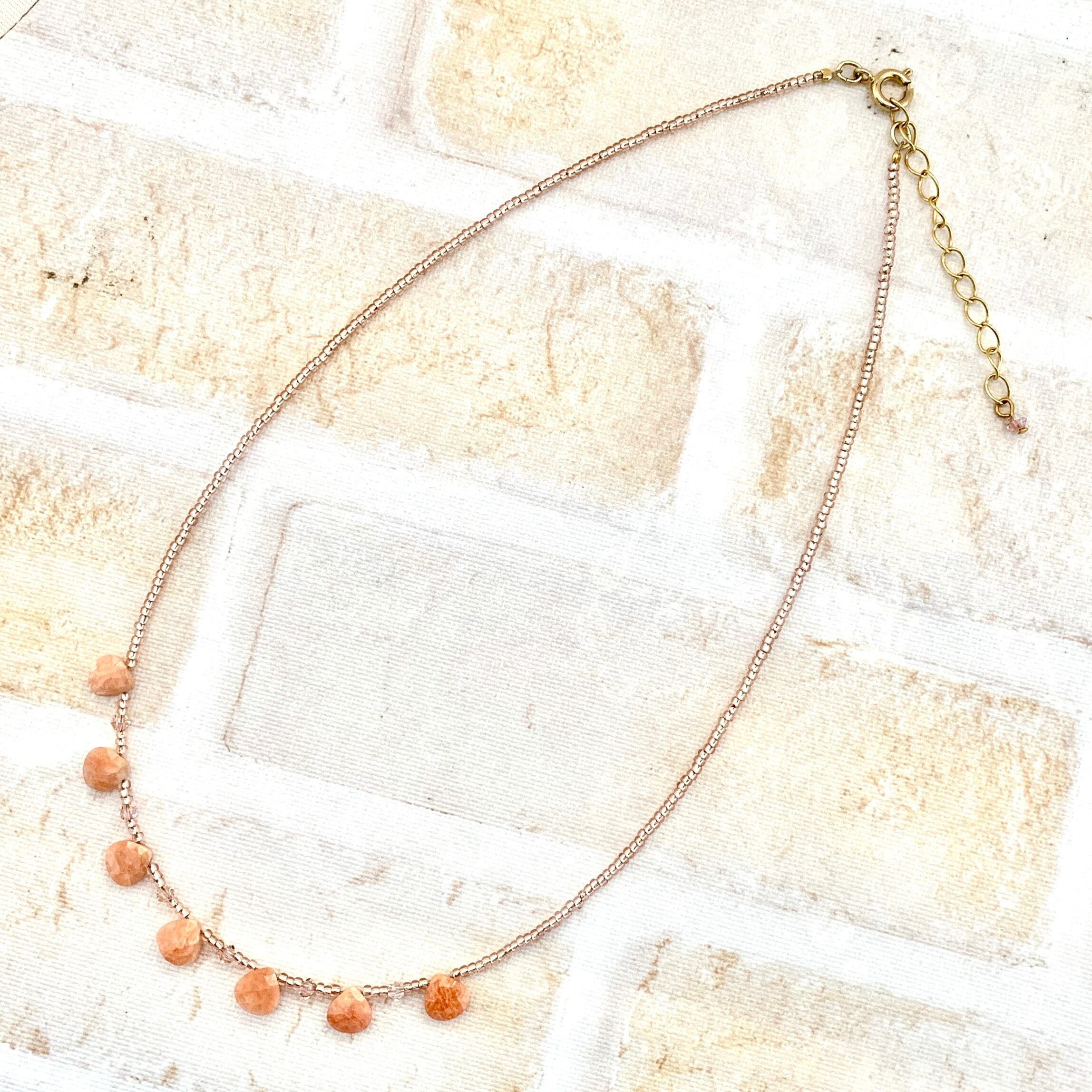 長石類の一種でミルキーなオレンジ色に原石由来の模様が見られる可愛らしいお色の天然石。