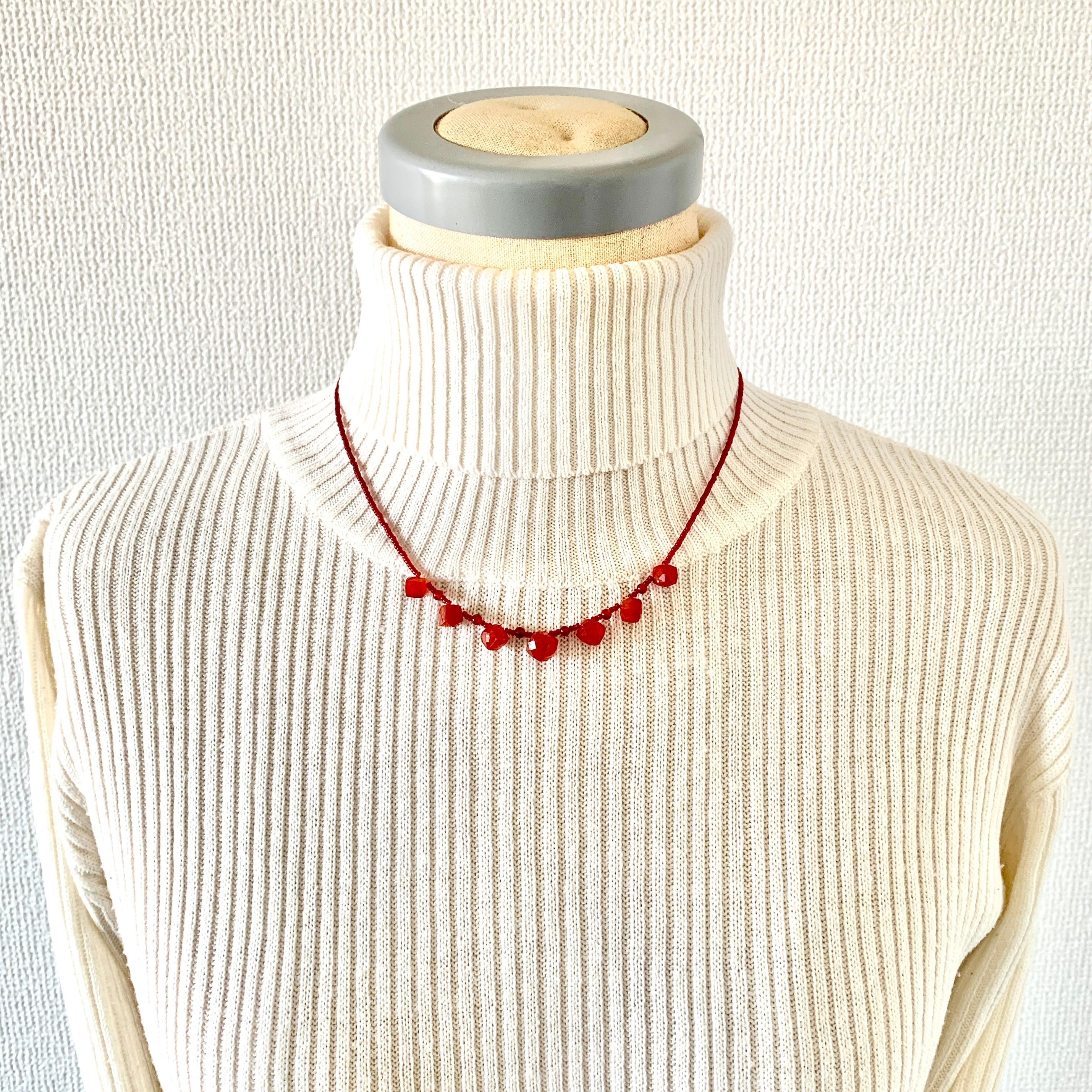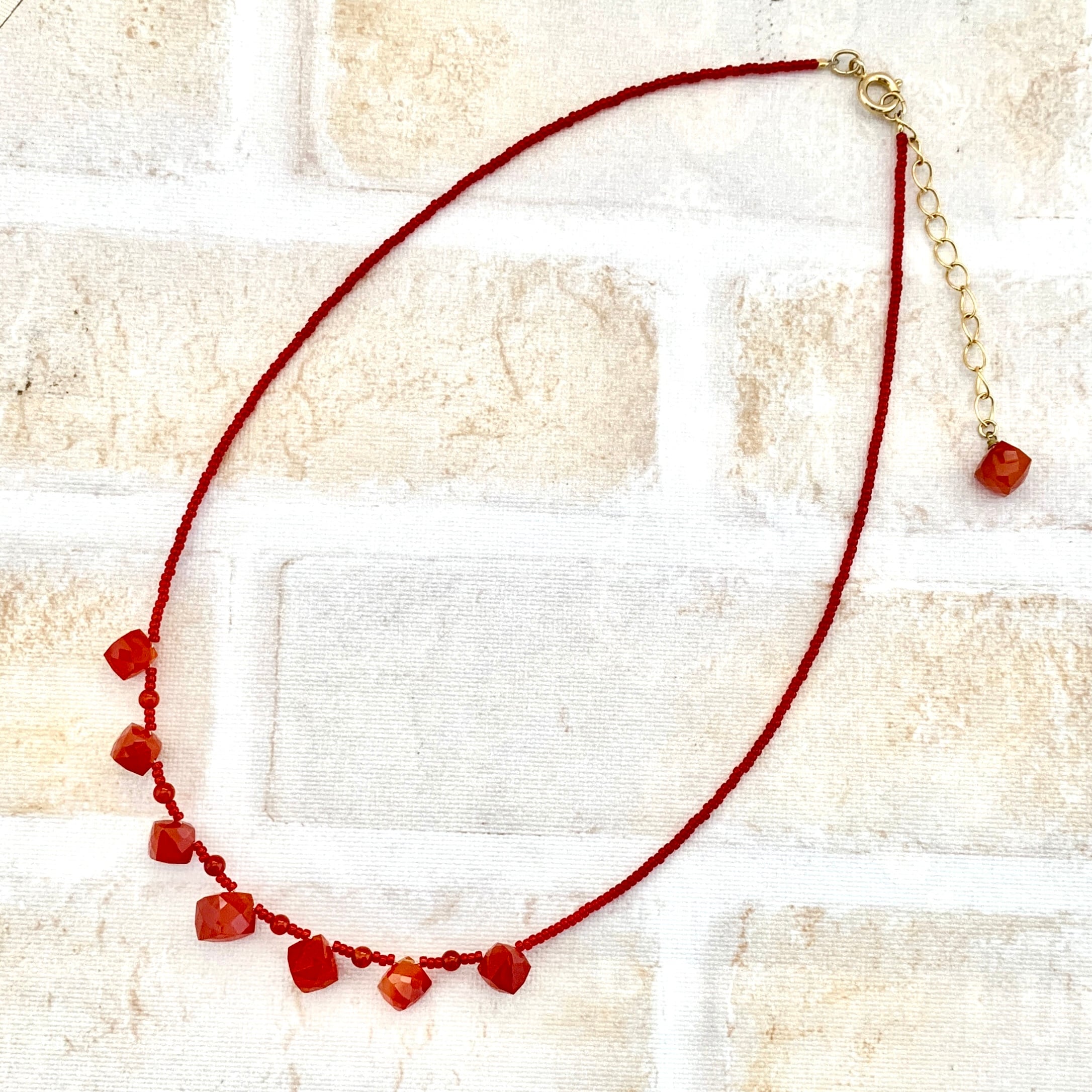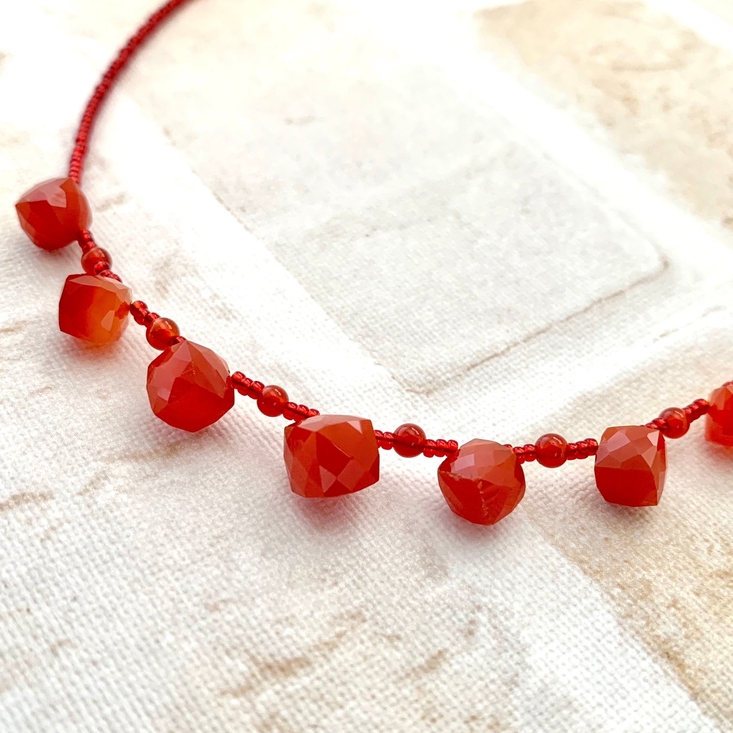 派手すぎない落ち着いた赤色で全面にカッティングが施されているためどの角度からも美しく輝く少し個性的なダイスカットのめのうを使用したネックレスです。
