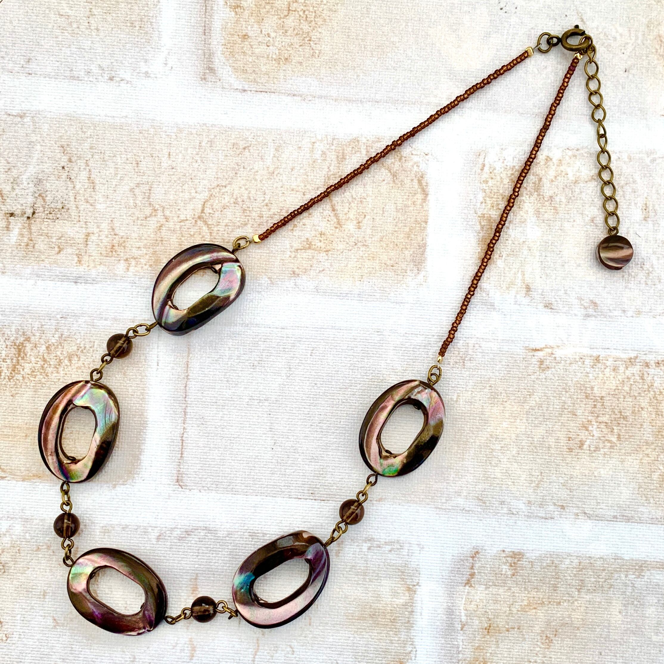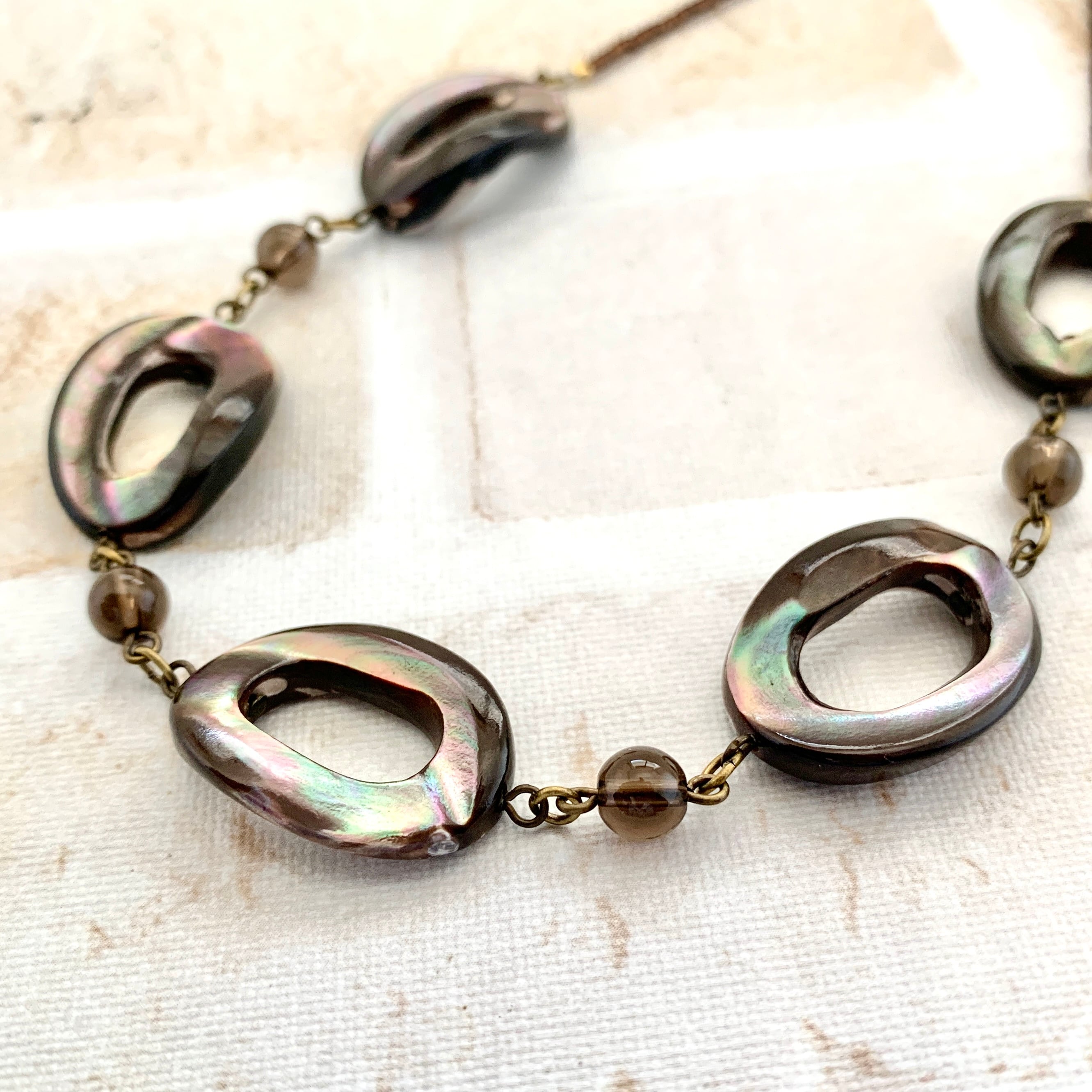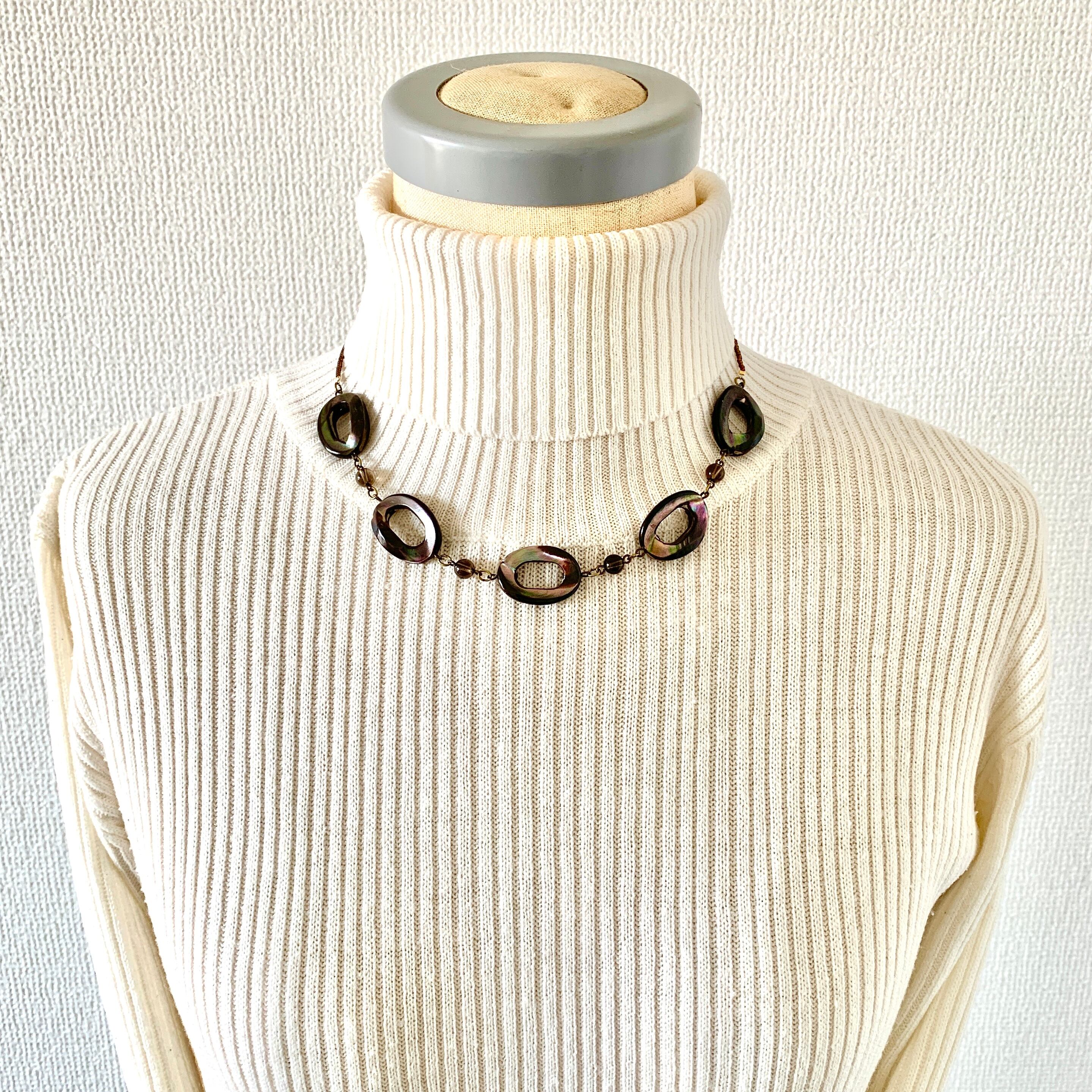ブラウンカラーの光沢が落ち着いた雰囲気のマザーオブパール(貝)に透明感がある綺麗なスモーキークォーツを合わせチェーンのように繋ぎガラスビーズと合わせてお作りしました。